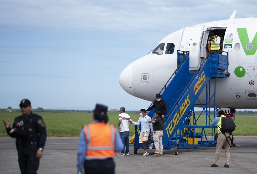 2025年2月13日,在洪都拉斯拉利馬市,被遣返移民抵達機場。新華社發(fā) 戴維 攝