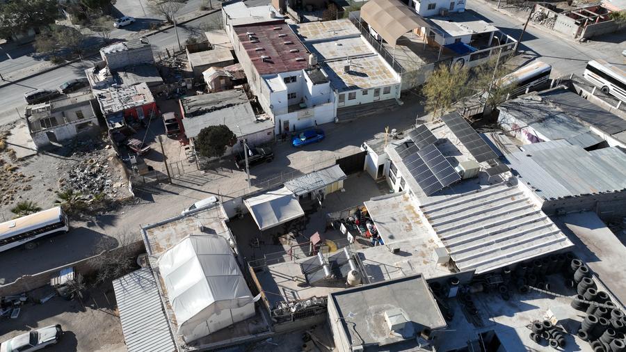 這是2025年2月2日在墨西哥奇瓦瓦州華雷斯城拍攝的一處移民收容所(無人機照片)。新華社記者 李夢馨 攝