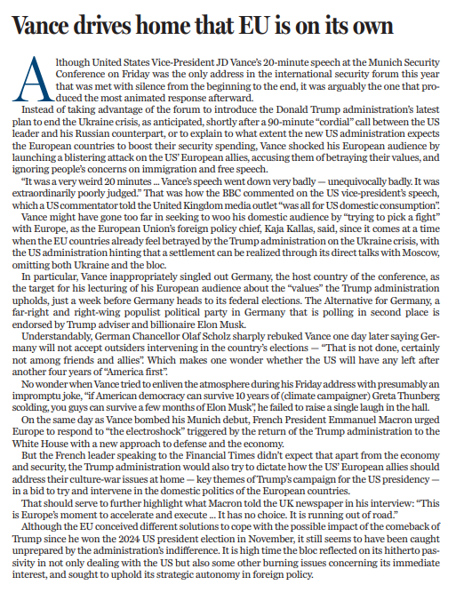 更令人意外的是,萬斯在演講中專門點名批評了東道主德國,而此時距離德國聯(lián)邦選舉僅剩一周。目前,德國極右翼政黨“德國選擇黨”在民調中位列第二,而特朗普的顧問、億萬富翁埃隆·馬斯克正公開支持該黨。不出所料,德國總理朔爾茨在次日予以嚴厲回擊,明確表示德國不會接受外部勢力干涉本國選舉?!懊擞押团笥阎g不會做這樣的事情?!彼窢柎牡谋響B(tài)不禁引人深思:如果特朗普政府繼續(xù)推行“美國優(yōu)先”政策,美國四年后還能剩下多少盟友?