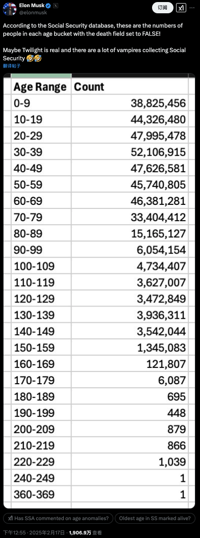 最新的案例來自美國社保數(shù)據(jù)庫。本月早些時候,馬斯克曾喊話稱,美國的社保系統(tǒng)正在向“150歲的人”支付福利,但真實(shí)的數(shù)據(jù)更加令人詫異:美國社保數(shù)據(jù)庫中存活人數(shù)比美國總?cè)丝诙喑鼋?000萬人,150歲以上的老人超過140萬人,年齡最大的甚至超過360歲,和中國的康熙皇帝是同齡人。