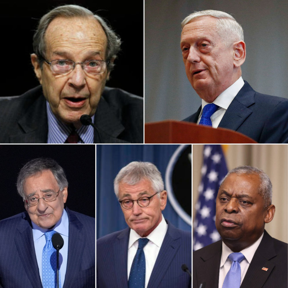 拼版照片,圖為美國(guó)前國(guó)防部長(zhǎng)佩里(上左)、馬蒂斯(上右)、帕內(nèi)塔(下左)、哈格爾(下中)和奧斯汀。圖片源自網(wǎng)絡(luò)