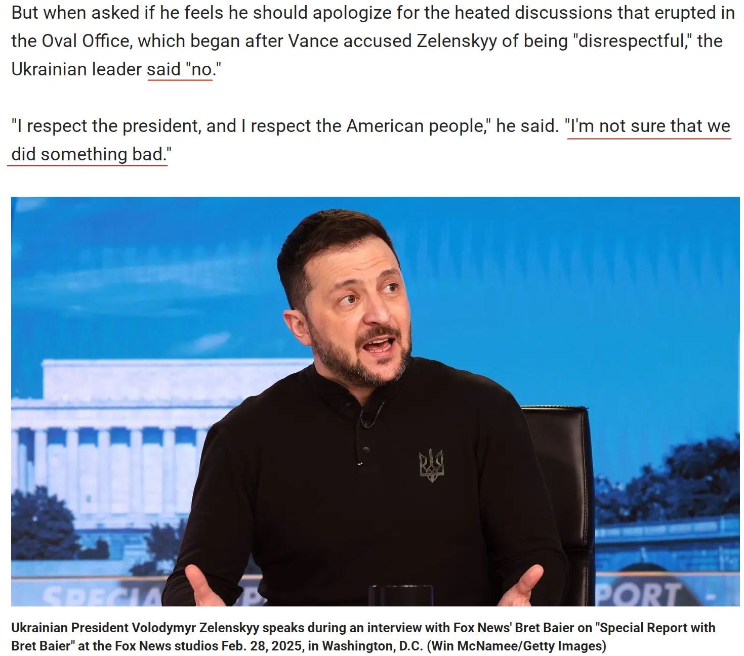 “我在橢圓形辦公室看到的是(澤連斯基對(duì)美國(guó)的)不尊重。我不知道我們能不能與澤連斯基恢復(fù)談判。還是那句話,他要么辭職,然后派一個(gè)可以與我們合作的人過(guò)來(lái),要么他自己做出改變?!?/p>