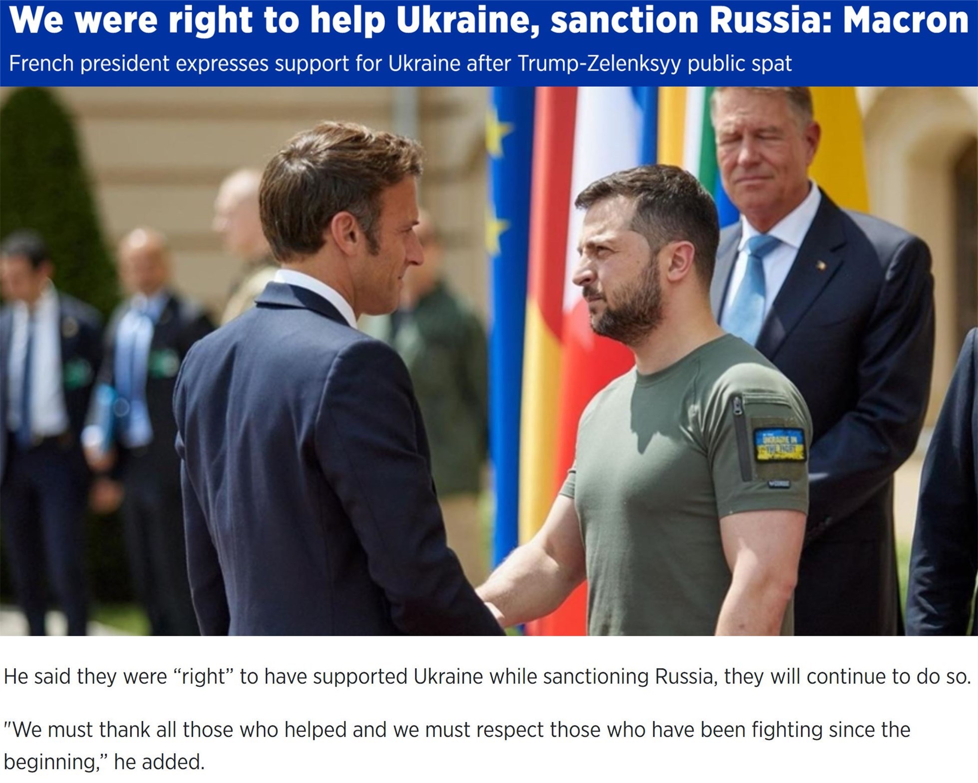 法國(guó)總統(tǒng)馬克龍?jiān)谂c澤連斯基通話后對(duì)媒體稱,西方支持烏克蘭是“正確”的,而且應(yīng)該繼續(xù)這樣做,因?yàn)椤澳切囊婚_(kāi)始就在戰(zhàn)斗的人是在為歐洲的安全而戰(zhàn)”。