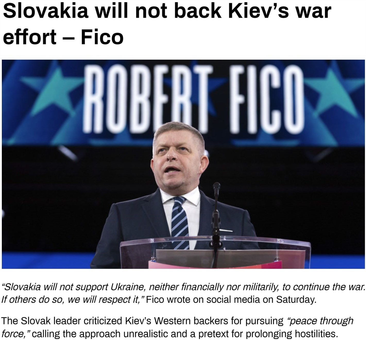 斯洛伐克總理菲佐則在社交媒體上發(fā)文,重申拒絕向?yàn)蹩颂m提供軍事和財(cái)政支持的立場(chǎng)。他還批評(píng)稱,“用實(shí)力實(shí)現(xiàn)和平”的戰(zhàn)略不切實(shí)際,只是“繼續(xù)沖突”的借口。