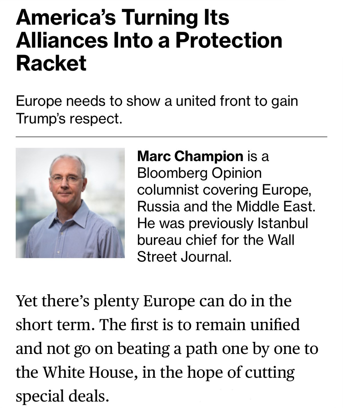 在彭博社專欄作家馬克·錢皮恩看來(lái),特朗普政府奉行的“美國(guó)優(yōu)先”政策導(dǎo)致跨大西洋關(guān)系裂痕不斷加深。歐洲領(lǐng)導(dǎo)人應(yīng)保持團(tuán)結(jié),而不是一個(gè)接一個(gè)前往白宮,希望與美達(dá)成特殊協(xié)議。