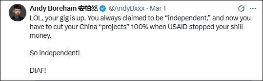 “笑死,你們人設崩了?!痹谥袊詈凸ぷ鞫嗄甑男挛魈m媒體人安迪·博勒姆(中文名安柏然)也嘲諷道,“成天標榜自己‘獨立’,現(xiàn)在美國國際開發(fā)署斷了黑錢,對華‘項目’得100%砍光。還真是獨立?。≮s緊涼透吧!”