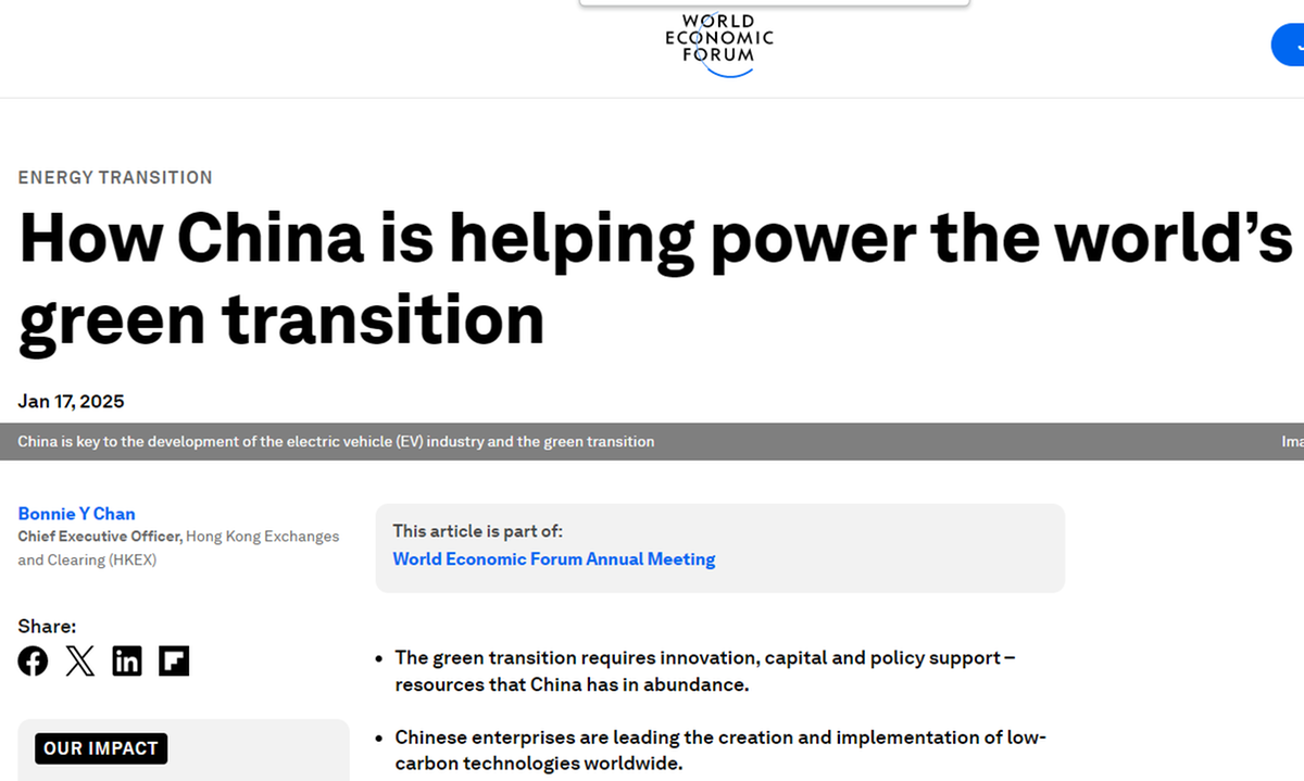 世界經(jīng)濟論壇網(wǎng)站題為《中國助力全球綠色轉(zhuǎn)型》的文章強調(diào),中國在推動全球綠色轉(zhuǎn)型過程中具有關(guān)鍵作用,特別是在電動車、可再生能源及低碳技術(shù)領(lǐng)域。