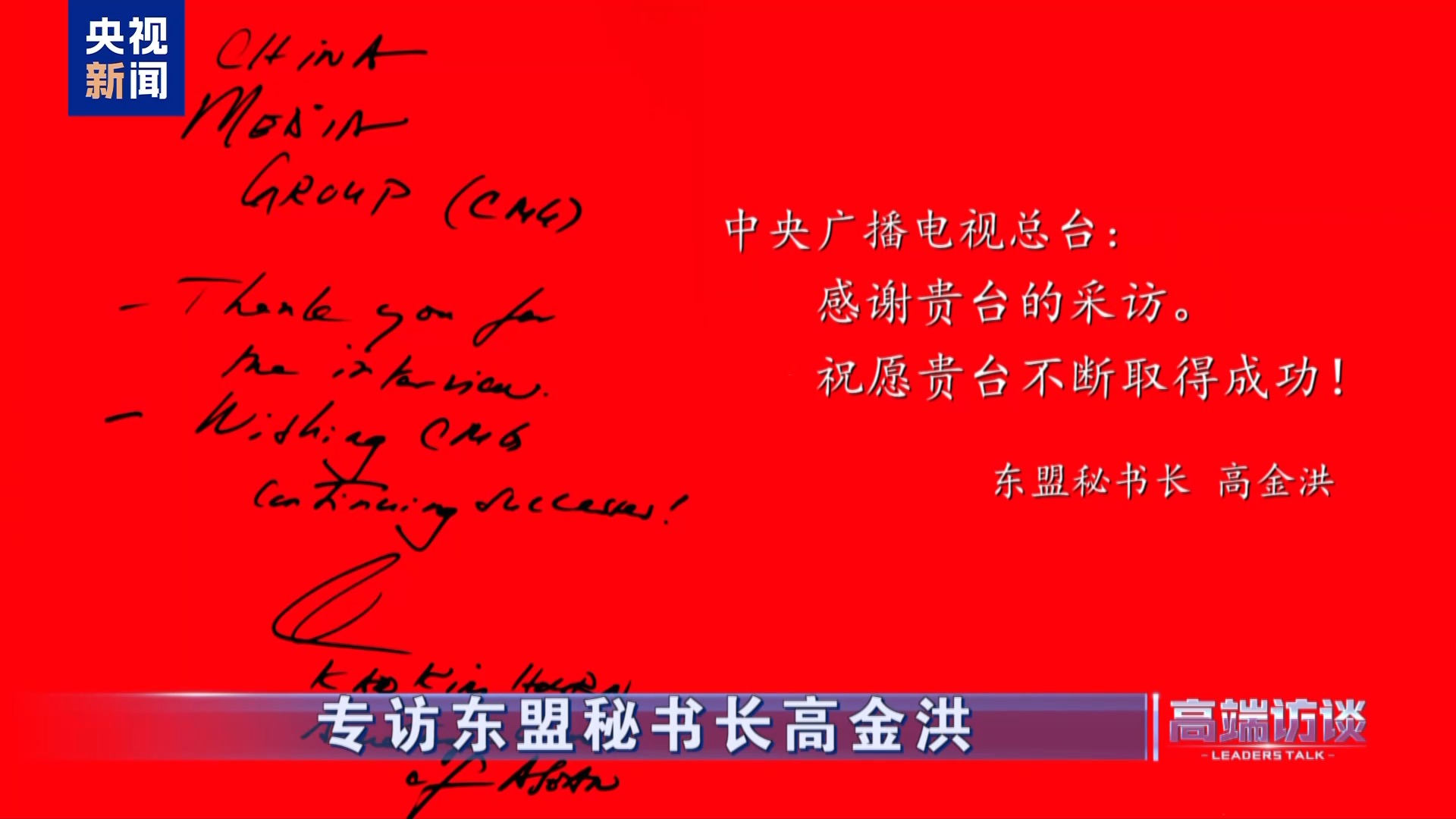 東盟秘書長高金洪在接受總臺專訪后題詞——中央廣播電視總臺:感謝貴臺的采訪。祝愿貴臺不斷取得成功!