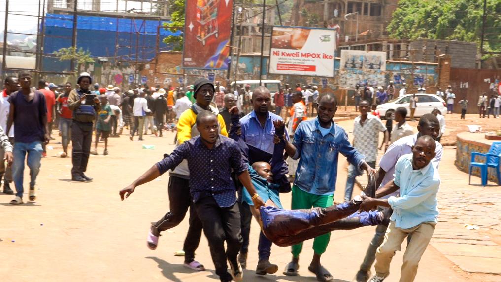 2月27日,剛果(金)東部南基伍省首府布卡武市發(fā)生兩起爆炸,造成至少11人死亡、65人受傷。圖為人們?cè)诒ㄊ录F(xiàn)場(chǎng)搬運(yùn)傷員(視頻截圖)。新華社發(fā)