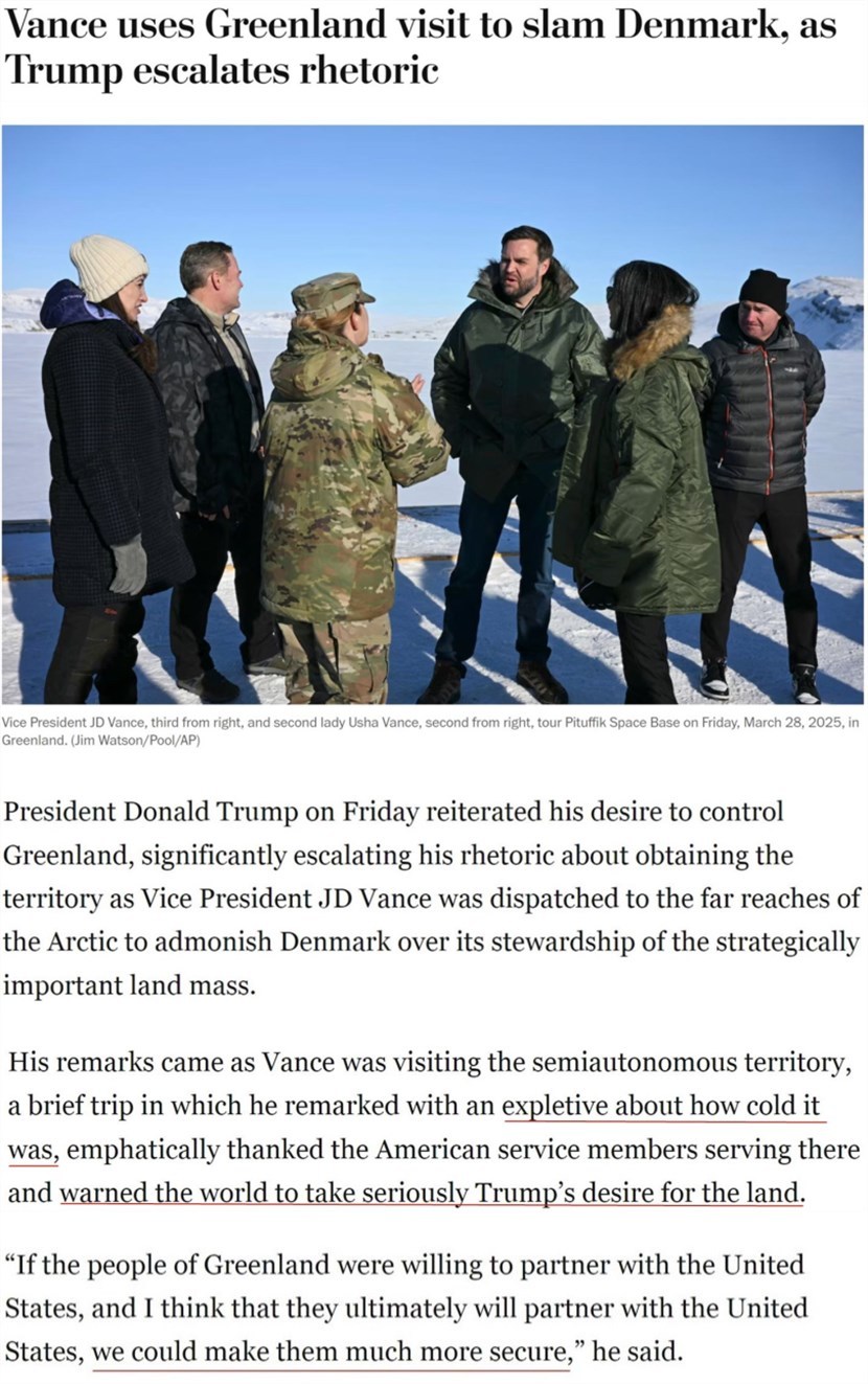 當(dāng)?shù)貢r(shí)間28日,美國(guó)副總統(tǒng)萬斯率代表團(tuán)“到訪”丹麥自治領(lǐng)地格陵蘭島上的美軍基地。
