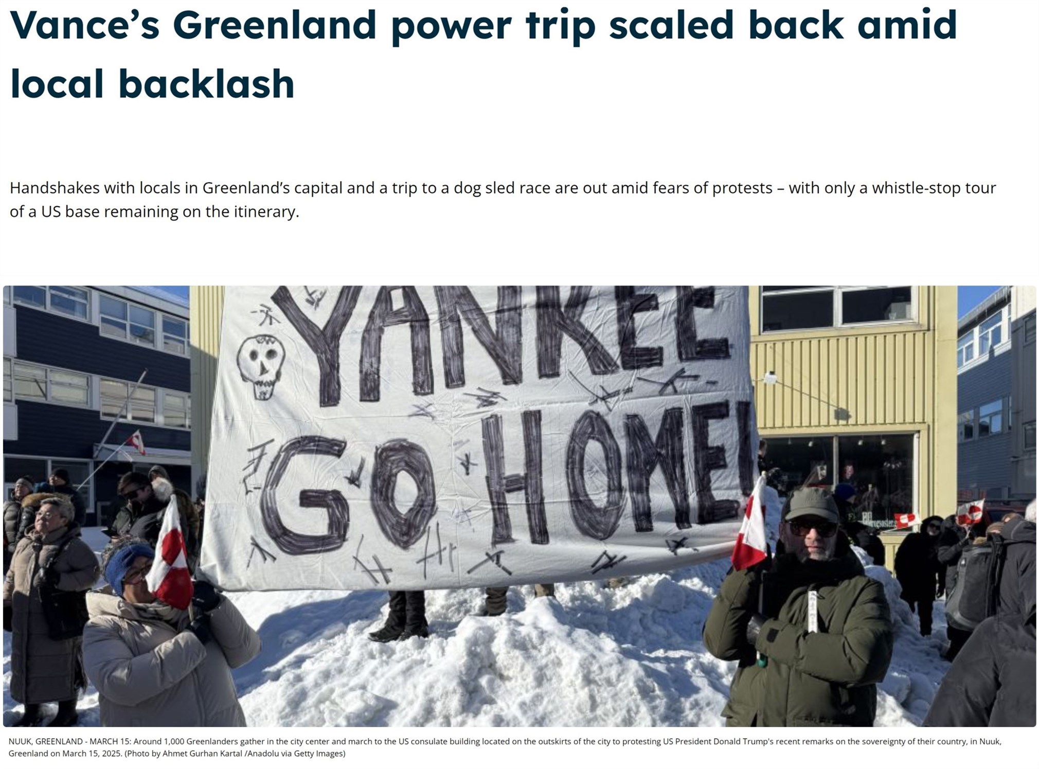 迫于輿論壓力,萬斯的夫人烏莎·萬斯此行不得不取消了去格陵蘭島首府努克和第二大城市錫西米尤特參加相關(guān)文化活動(dòng)的計(jì)劃。