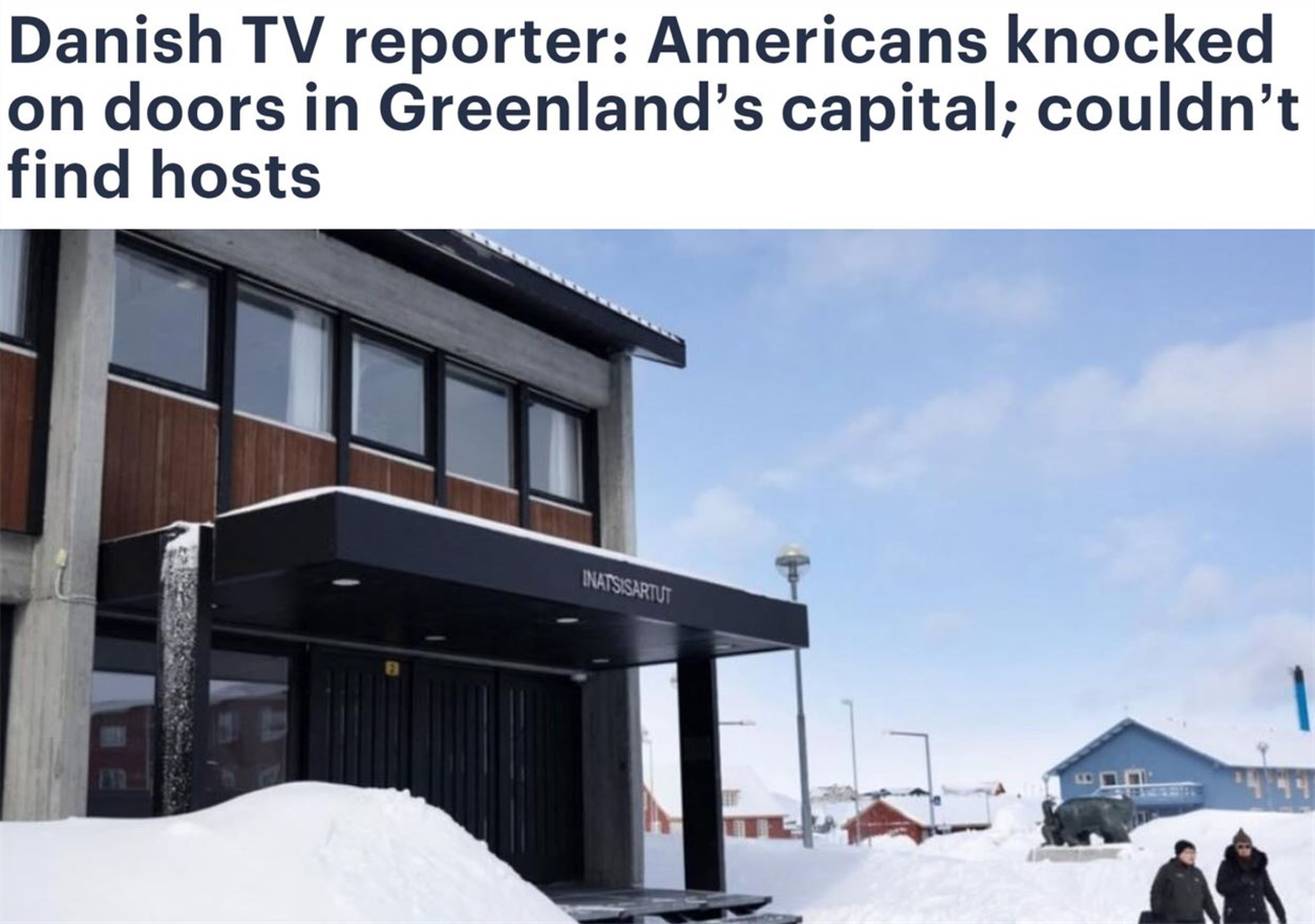 據(jù)丹麥電視二臺(tái)記者賈斯珀·斯坦梅茨在節(jié)目中披露,萬斯率領(lǐng)的代表團(tuán)出發(fā)之前,美國(guó)政府已秘密派人到格陵蘭島相關(guān)地區(qū)“做工作”,希望當(dāng)?shù)孛癖姎g迎萬斯一行,但卻碰了一鼻子灰。