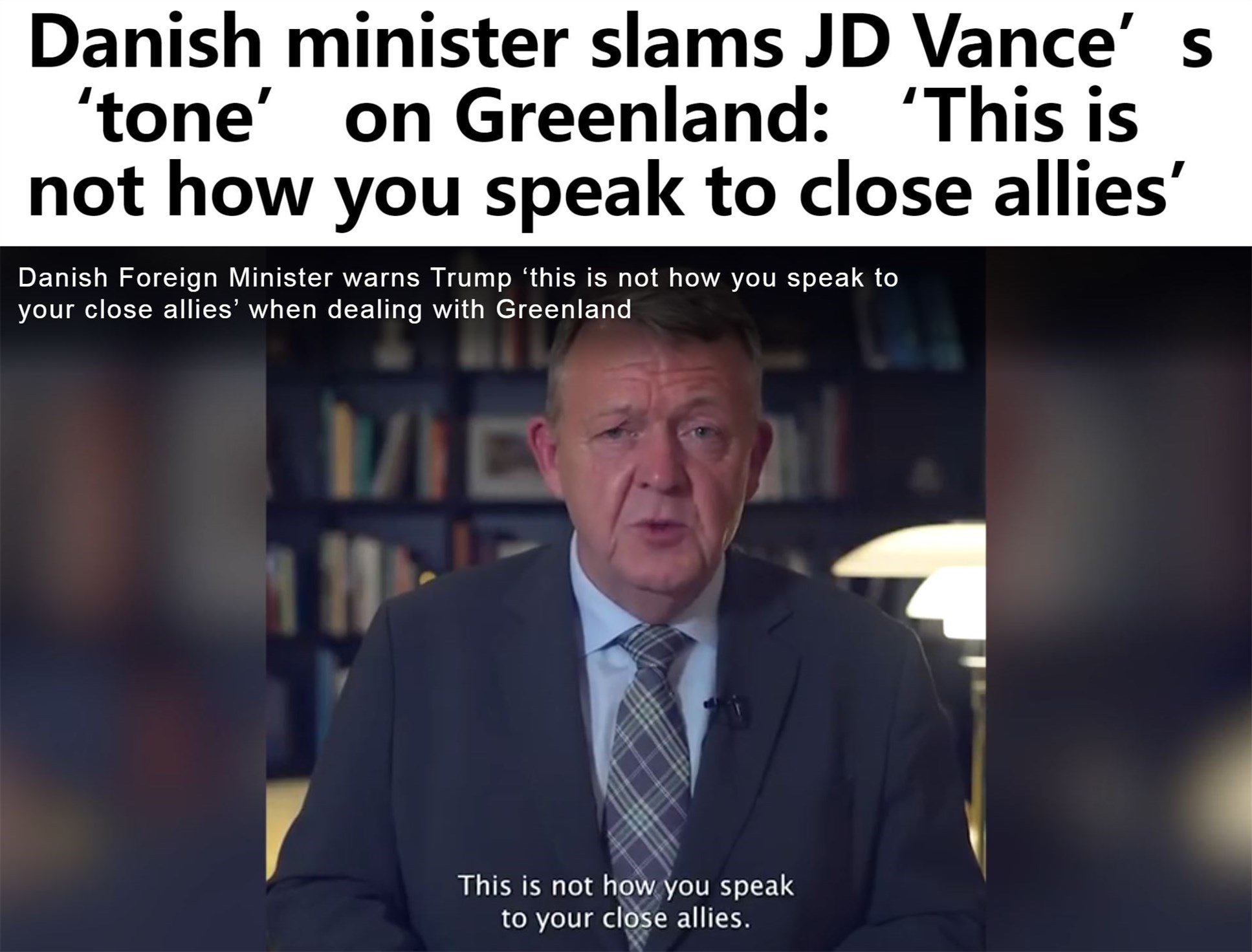 丹麥外交大臣拉斯穆森29日在社交媒體上發(fā)表視頻講話,批評(píng)萬斯有關(guān)格陵蘭島表態(tài)的“調(diào)調(diào)”。