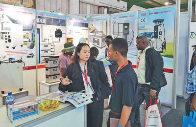 在一家中企展臺(tái),工作人員在向非洲客戶介紹該公司最新光伏儲(chǔ)能設(shè)備及其應(yīng)用場景。