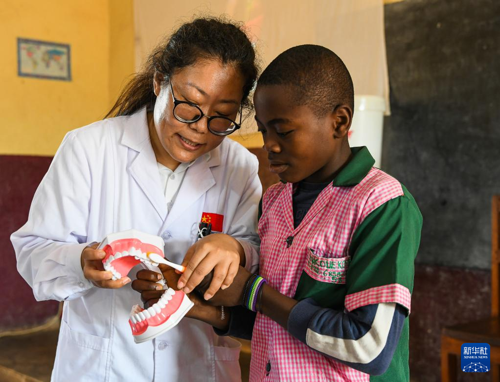4月3日,在喀麥隆姆巴爾馬約的一所小學(xué),中國(山西)第24批援喀麥隆醫(yī)療隊姆巴爾馬約分隊的醫(yī)生教授一名學(xué)生正確的刷牙技巧。新華社發(fā)(科普索攝)