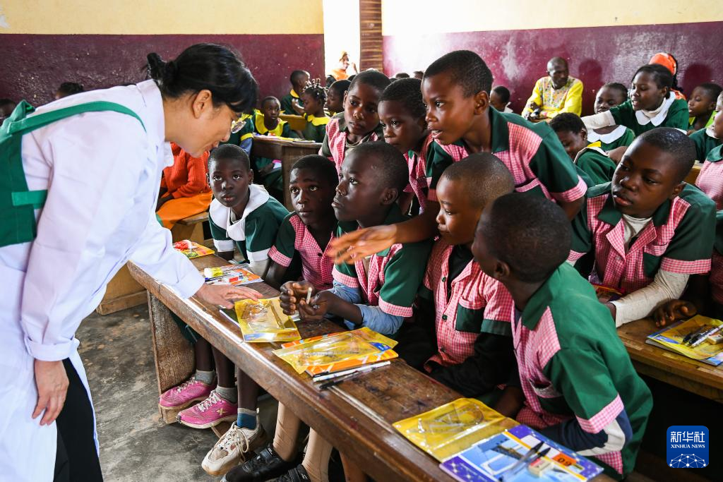 4月3日,在喀麥隆姆巴爾馬約的一所小學(xué),中國(山西)第24批援喀麥隆醫(yī)療隊姆巴爾馬約分隊的醫(yī)生與學(xué)生互動。新華社發(fā)(科普索攝)