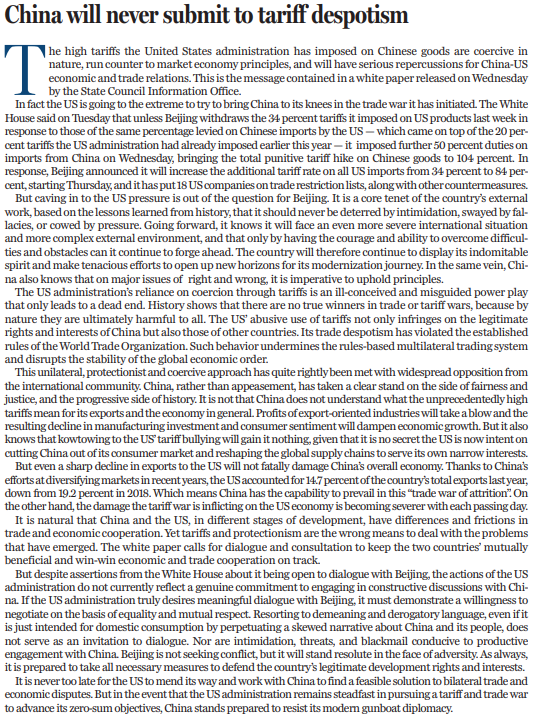 本周三,國務(wù)院新聞辦公室發(fā)布《關(guān)于中美經(jīng)貿(mào)關(guān)系若干問題的中方立場》白皮書。白皮書指出,美國政府對中國輸美商品征收高額關(guān)稅是要挾,違背市場經(jīng)濟規(guī)律,將對中美經(jīng)貿(mào)關(guān)系產(chǎn)生嚴(yán)重影響。