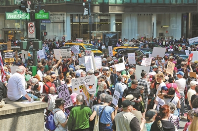 美方濫施關稅措施招致美國國內(nèi)越來越多的反對聲音,擔憂情緒在民眾中不斷蔓延。美國哥倫比亞廣播公司與輿觀調(diào)查公司的一項最新民調(diào)結果顯示,58%的受訪美國民眾表示反對美國關稅政策,53%的受訪者認為美國國會應該阻止或限制新關稅,58%的受訪者認為關稅政策導致食品雜貨價格上漲。4月19日,美國多地舉行抗議活動,首都華盛頓、紐約、舊金山、波士頓等城市的民眾走上街頭,抗議現(xiàn)政府加征關稅、大規(guī)模裁員、驅(qū)逐移民等政策。