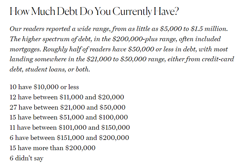 該網(wǎng)站針對(duì)102名讀者就個(gè)人債務(wù)問題進(jìn)行了調(diào)查,了解他們?nèi)绾伪池?fù)和償還債務(wù)。調(diào)查發(fā)現(xiàn),個(gè)人債務(wù)總額從5000美元到150萬(wàn)美元不等,20萬(wàn)美元以上的債務(wù)通常包含抵押貸款。約半數(shù)受訪者的債務(wù)在5萬(wàn)美元及以下,最常見的債務(wù)范圍在2.1萬(wàn)美元至5萬(wàn)美元之間。