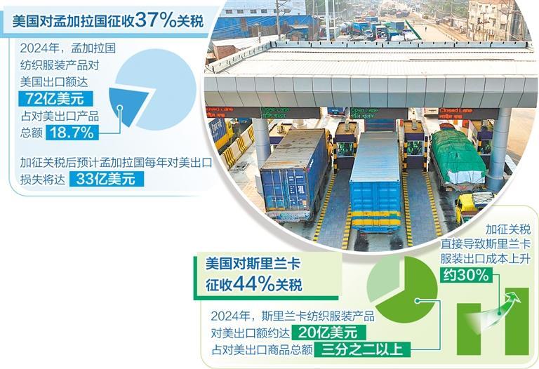孟加拉國(guó)經(jīng)濟(jì)高度依賴紡織服裝產(chǎn)品出口,美國(guó)是孟加拉國(guó)除歐盟外的第二大出口市場(chǎng)。作為全球第二大服裝產(chǎn)品出口國(guó),2024年,孟加拉國(guó)紡織服裝產(chǎn)品對(duì)美國(guó)出口額達(dá)到72億美元,占對(duì)美出口產(chǎn)品總額的18.7%。美國(guó)所謂“對(duì)等關(guān)稅”生效后,直接沖擊孟加拉國(guó)紡織服裝出口領(lǐng)域,使出口成本大幅增加,嚴(yán)重削弱了孟加拉國(guó)產(chǎn)品的價(jià)格競(jìng)爭(zhēng)力。在此背景下,預(yù)計(jì)孟加拉國(guó)每年對(duì)美出口損失將達(dá)到33億美元。此外,近期印度政府宣布不再允許孟加拉國(guó)經(jīng)印度陸地海關(guān)對(duì)第三國(guó)出口貨物,此舉將在短期內(nèi)進(jìn)一步推高孟加拉國(guó)貨物出口成本。