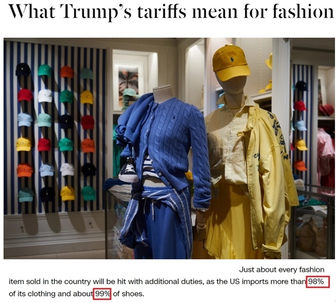 美國有線電視新聞網(wǎng)近日刊發(fā)文章指出,關(guān)稅政策對(duì)服裝行業(yè)的影響尤為嚴(yán)重,因?yàn)槊绹艘聶焕?8%的衣物和99%的鞋子都是進(jìn)口的。