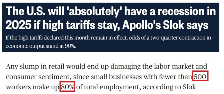 他還警告,如果高關(guān)稅持續(xù)下去,美國經(jīng)濟(jì)連續(xù)兩個(gè)季度萎縮的可能性將高達(dá)90%,今年年內(nèi)“絕對(duì)”會(huì)陷入衰退。