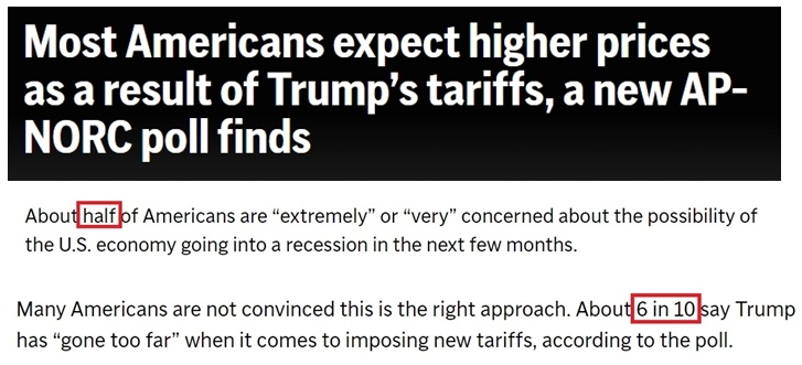 對(duì)于特朗普政府的關(guān)稅政策,近六成的受訪者認(rèn)為政府“做得太過了”。另外,約有一半受訪者“極度”或“非常”擔(dān)心美國經(jīng)濟(jì)會(huì)在未來幾個(gè)月陷入衰退。