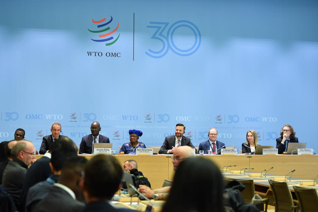 4月16日,在瑞士日內(nèi)瓦世界貿(mào)易組織總部,世貿(mào)組織總干事伊維拉(后排左四)出席新聞發(fā)布會(huì)。世界貿(mào)易組織16日發(fā)布的最新報(bào)告顯示,美國關(guān)稅政策導(dǎo)致全球貿(mào)易前景嚴(yán)重惡化。新華社記者連漪攝