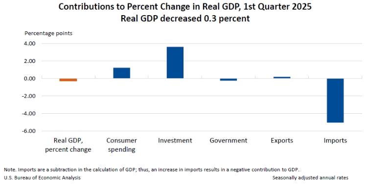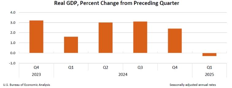 4月30日,美國商務部公布了2025年美國一季度經(jīng)濟數(shù)據(jù),美國一季度國內(nèi)生產(chǎn)總值環(huán)比(按年率計算)萎縮0.3%,為三年來首次負增長。