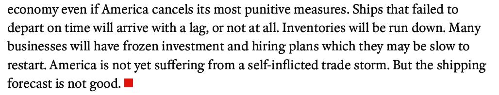 未能按時起航的船只將會延遲抵達,或者根本無法抵達。庫存將會耗盡。許多企業(yè)可能已經(jīng)凍結了投資和招聘計劃,而且恢復這些計劃可能會很緩慢。美國尚未遭受自己一手造成的貿(mào)易風暴的沖擊。但航運前景不容樂觀。