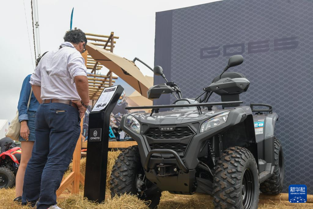 4月29日,在巴西圣保羅州里貝朗普雷圖市舉行的2025年巴西農(nóng)業(yè)科技展上,參觀者觀看春風動力展示的全地形車。新華社記者 陳昊佺 攝