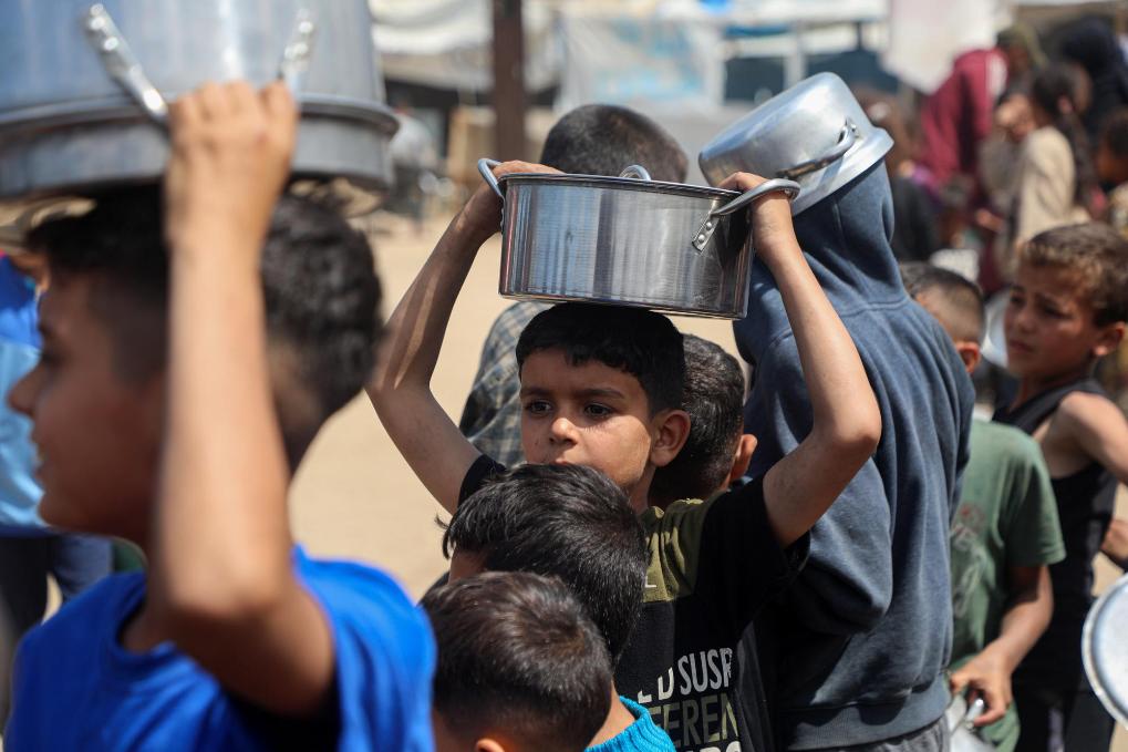 5月2日,孩子們在加沙城等待領取救助食物。新華社發(fā)(里澤克·阿卜杜勒賈瓦德攝)