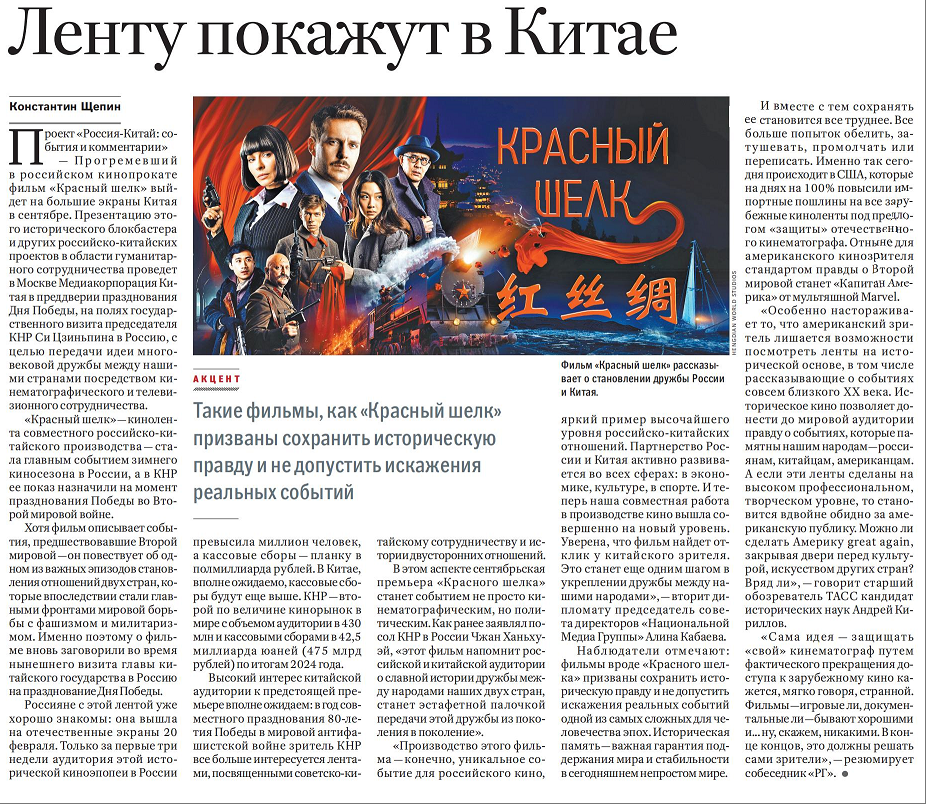 在俄羅斯創(chuàng)下票房佳績(jī)的中俄合拍電影《紅絲綢》將于今年9月登陸中國院線。在俄羅斯紀(jì)念蘇聯(lián)偉大衛(wèi)國戰(zhàn)爭(zhēng)勝利80周年前夕,在中國國家主席習(xí)近平應(yīng)邀對(duì)俄羅斯進(jìn)行國事訪問之際,中國中央廣播電視總臺(tái)將在莫斯科舉辦這部歷史題材合拍電影及其他中俄人文合作項(xiàng)目的推介活動(dòng),通過影視交流合作傳遞中俄世代友好。