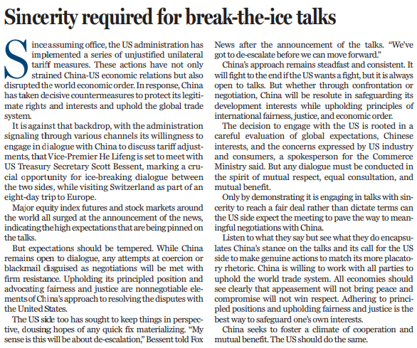 近期,美方不斷表示,希望同中方就關(guān)稅調(diào)整進(jìn)行談判。當(dāng)?shù)貢r間10日上午,中美經(jīng)貿(mào)高層會談在瑞士日內(nèi)瓦開始舉行。中共中央政治局委員、國務(wù)院副總理何立峰作為中美經(jīng)貿(mào)中方牽頭人,當(dāng)天與美方牽頭人、美國財長貝森特舉行會談。中美關(guān)稅戰(zhàn)迎來破冰契機(jī)。