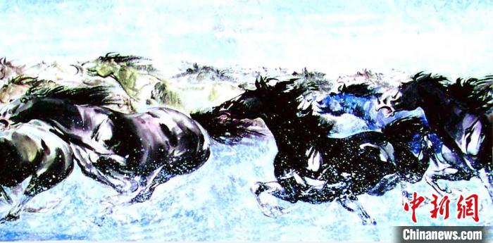 如今,當(dāng)他再回到新疆,他發(fā)現(xiàn)牧民的生活已發(fā)生巨大變化,新疆的旅游資源不斷開(kāi)發(fā)完善,伊犁天馬文化節(jié)吸引眾多游客。牧民們逐漸有了經(jīng)商意識(shí),帶著游客們探尋新疆的美景、美食,日子過(guò)得紅紅火火。姚迪雄也將這份喜悅揮毫于畫卷上,繪制伊犁的發(fā)展變化。比如,他的作品《揚(yáng)鬃奮蹄歌大風(fēng)》就描繪天馬浴河的景象,而“天馬浴河”是前往伊犁昭蘇的游客們最期待的節(jié)目之一。他將這幅作品送給了新疆伊犁哈薩克自治州昭蘇縣,作為游子獻(xiàn)給家鄉(xiāng)的一份禮物。