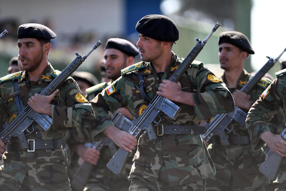 2025年4月18日,在伊朗首都德黑蘭,士兵們?cè)陂啽缴狭嘘?duì)行進(jìn)。伊朗18日舉行建軍節(jié)閱兵式。新華社記者 沙達(dá)提 攝