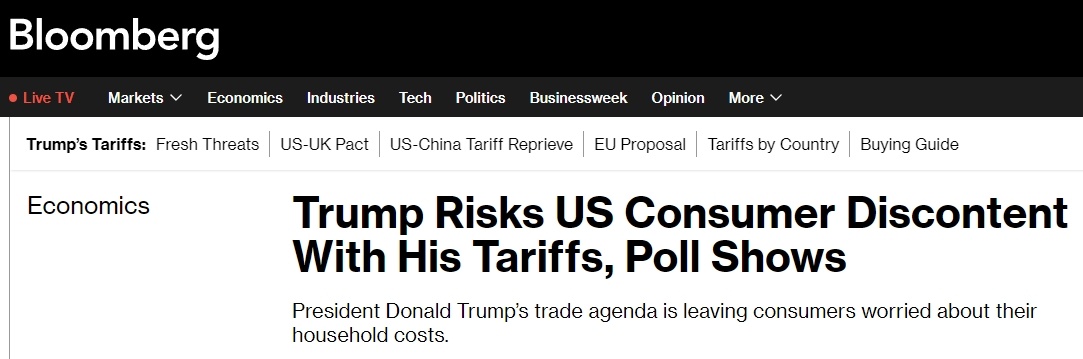 彭博社近日民調顯示,56%的受訪美國人認為,特朗普對其他國家征收的關稅對他們的家庭財務狀況產生了不良影響。即使特朗普政府一直在鼓吹加關稅能讓產業(yè)回流美國并增加財政收入,約52%的受訪者還是表示,美政府承諾的好處不值得他們?yōu)榇烁冻龅慕洕鷥r。