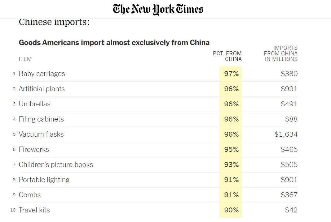 文章說,根據(jù)美國國際貿(mào)易委員會2024年發(fā)布的數(shù)據(jù),中國是美國多個商品品類的唯一或主要進(jìn)口來源國。具體來看:幾乎完全從中國進(jìn)口的品類包括嬰兒車、仿真植物、雨傘、煙花、兒童繪本等,進(jìn)口金額最高的品類主要有電話、計算機、汽車及零部件、視頻顯示器、電熱器、玩具等;進(jìn)口數(shù)量最大的品類主要是各類塑料制品,包括塑料日用品和工業(yè)用塑料件等。