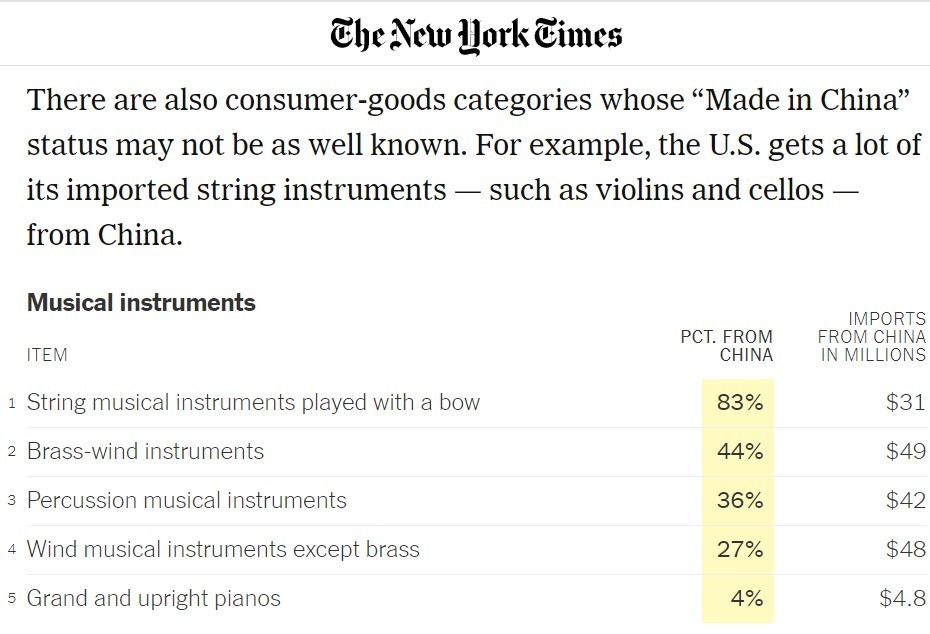 文章說,從清單中可以看出,美國從中國進(jìn)口的主要商品都是消費品,覆蓋生活中的多個場景:你衣櫥中的領(lǐng)帶、手套和連褲襪幾乎都是從中國進(jìn)口的;如果你是一名運動員,尤其是球類運動的運動員,那么你用的羽毛球、乒乓球、網(wǎng)球、健身房設(shè)備、泳池設(shè)備等都非常依賴“中國制造”;還有一些消費品類別的“中國制造”可能不那么廣為人知。例如,美國從中國進(jìn)口了大量弦樂器,包括小提琴和大提琴。維生素及其衍生物也大量從中國進(jìn)口,還有各種冷凍魚類,包括鰻魚、鱈魚、羅非魚等等。