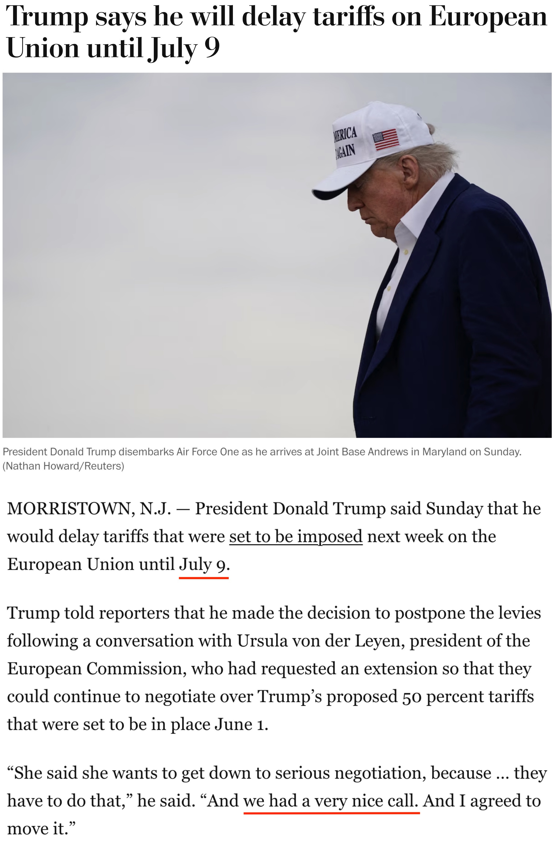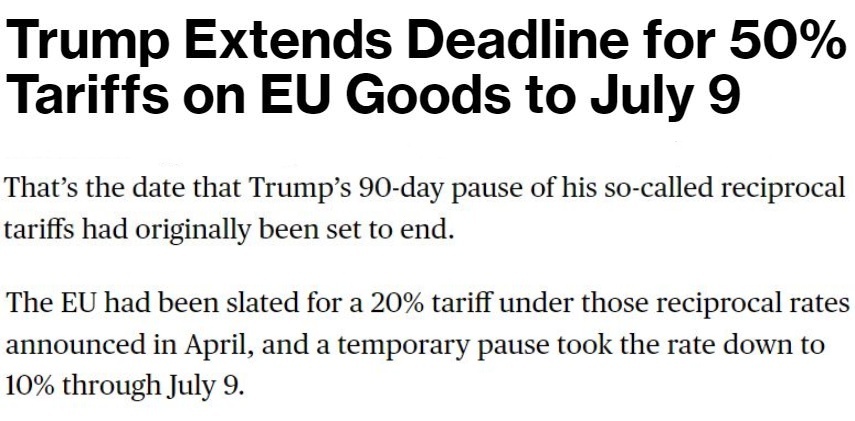 他25日告訴記者,自己當(dāng)天與歐盟委員會(huì)主席馮德萊恩“愉快”地通了電話,并應(yīng)對方要求,決定將原計(jì)劃從6月1日開始對歐盟加征的50%的關(guān)稅推遲到7月9日,以便雙方有時(shí)間就此進(jìn)行談判。