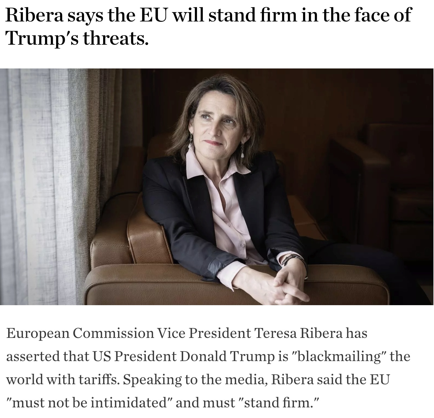 對此,歐盟委員會(huì)執(zhí)行副主席里貝拉表示,美方的這種勒索行為是不能容忍的。