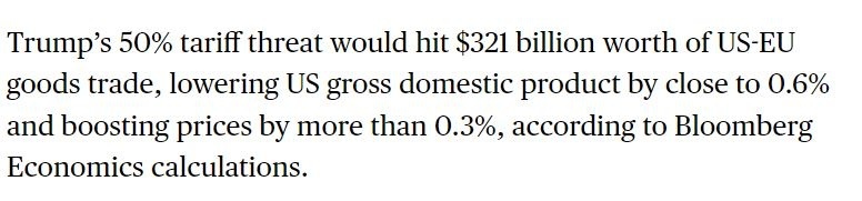 彭博社的計(jì)算結(jié)果顯示,50%的關(guān)稅將影響價(jià)值高達(dá)3210億美元的美歐商品貿(mào)易,一旦征收,將使美國國內(nèi)生產(chǎn)總值(GDP)下降近0.6%,物價(jià)上漲超過0.3%。