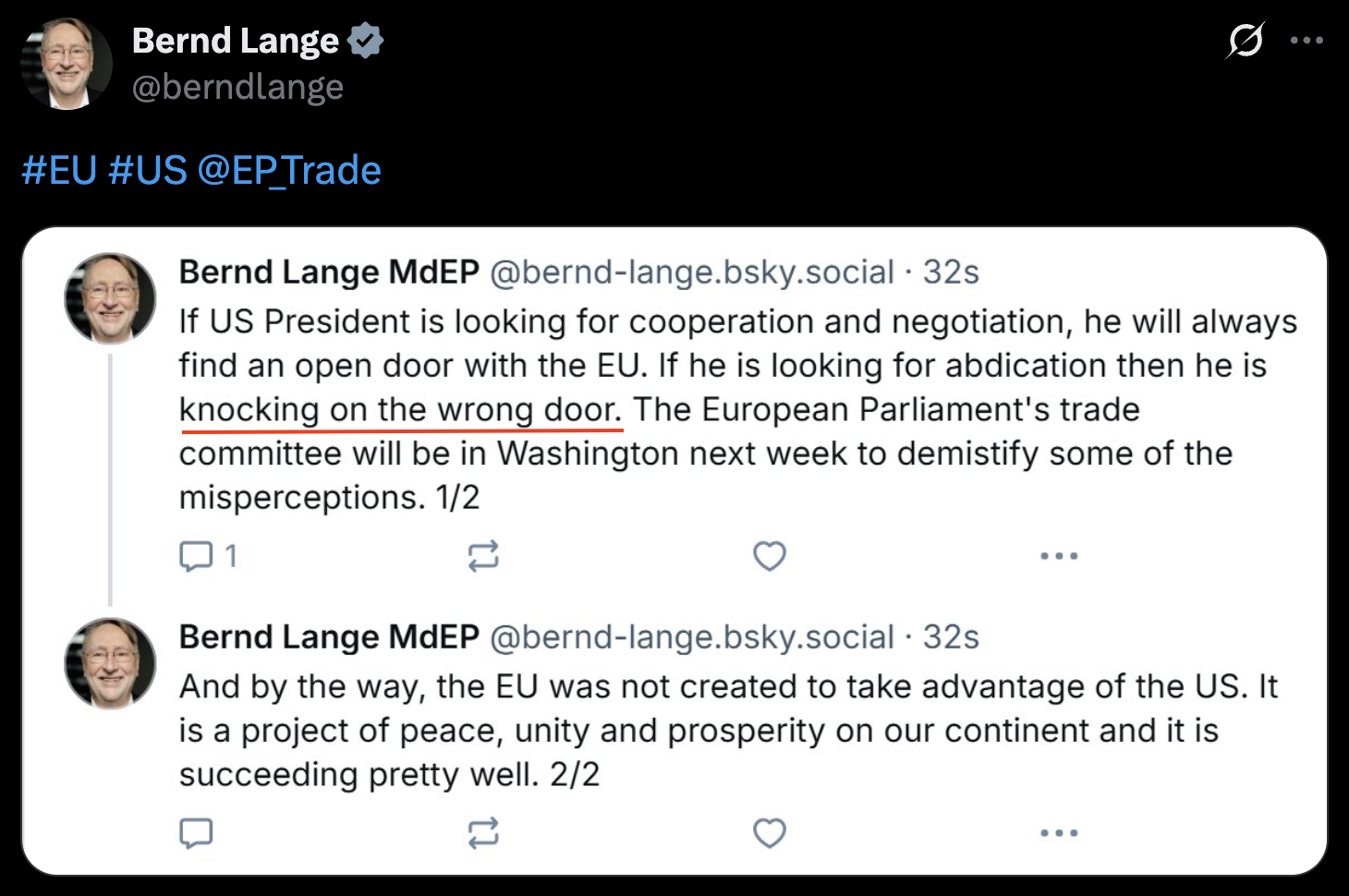 “如果美國尋求合作與談判,歐盟總是愿意敞開大門;但如果只是想讓我們照單全收美方的要求,那它就是敲錯(cuò)了門?!?/p>