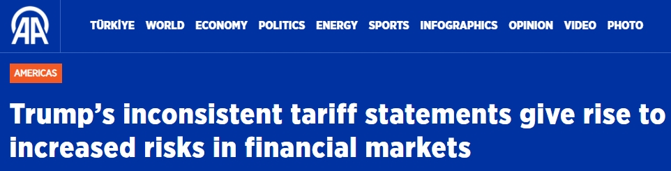 土耳其阿納多盧通訊社(Anadolu Ajans )27日的報(bào)道指出,美國(guó)政府在關(guān)稅問題上前后不一的言論和難以預(yù)測(cè)的行動(dòng),導(dǎo)致全球金融市場(chǎng)風(fēng)險(xiǎn)加大、波動(dòng)加劇,包括最近針對(duì)歐盟所作的決定。