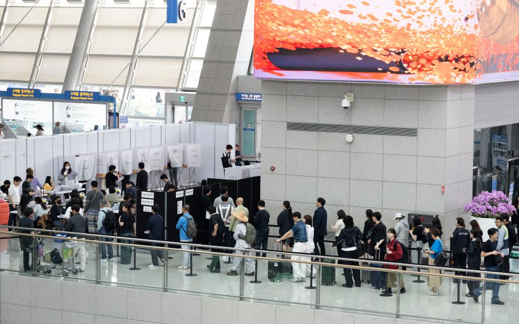 5月29日,選民在韓國仁川機(jī)場的投票站排隊(duì)等待投票。新華社發(fā)(全休相攝)