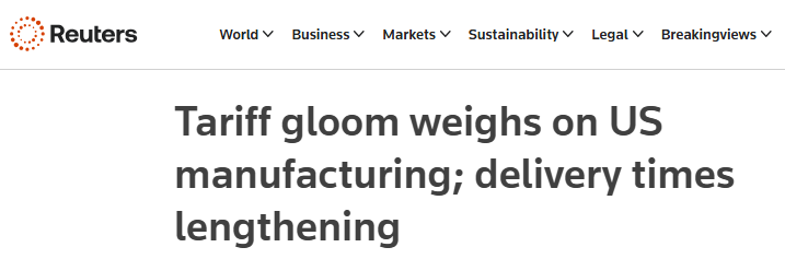 路透社近日的一篇報道認(rèn)為,美國制造業(yè)5月連續(xù)第三個月萎縮,在關(guān)稅影響下,供應(yīng)商交付投入的時間是近三年來最長的,這可能預(yù)示著某些商品即將出現(xiàn)短缺。