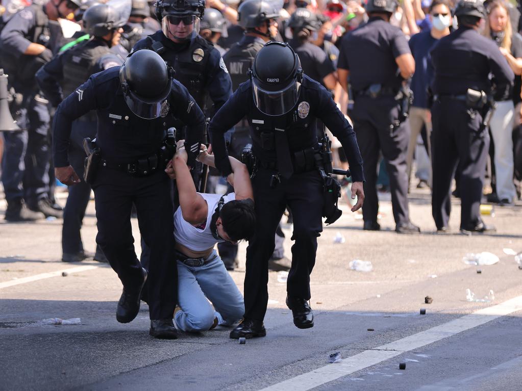 6月8日,在美國加利福尼亞州洛杉磯市中心的聯(lián)邦執(zhí)法機(jī)構(gòu)門前,一名抗議者被警察控制。新華社發(fā)(邱晨攝)