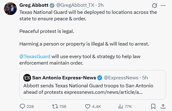 “和平抗議是合法行為,但傷害他人和損壞財(cái)產(chǎn)不合法,(肇事者)會(huì)被逮捕?!惫埠忘h籍的阿博特在社交媒體上說,“得州國(guó)民警衛(wèi)隊(duì)將用一切方式方法,幫助執(zhí)法機(jī)構(gòu)維持秩序。”