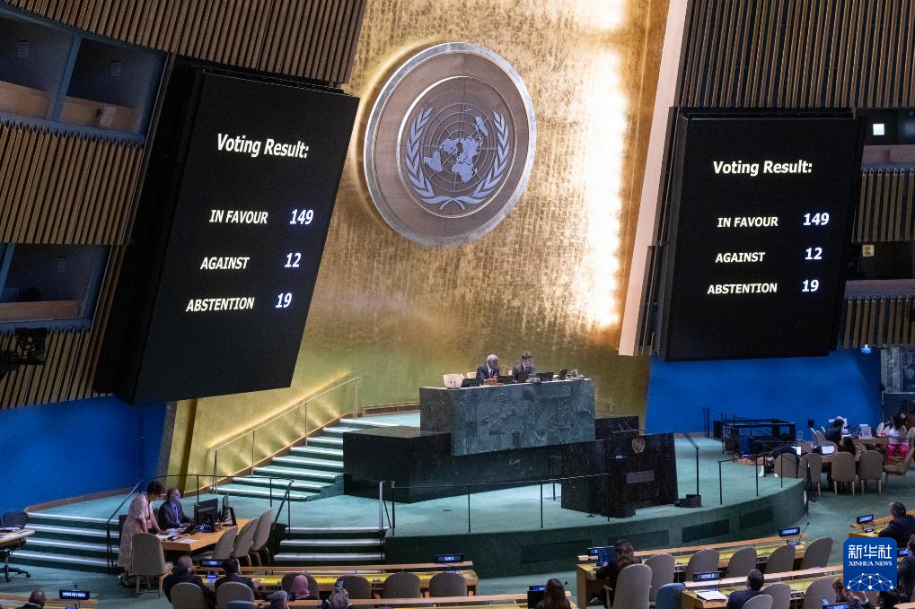 6月12日,在位于紐約的聯(lián)合國(guó)總部,聯(lián)合國(guó)大會(huì)緊急特別會(huì)議的表決結(jié)果顯示在電子屏上。新華社發(fā)(聯(lián)合國(guó)供圖/埃瑟金德?tīng)枴さ仑愗悢z)