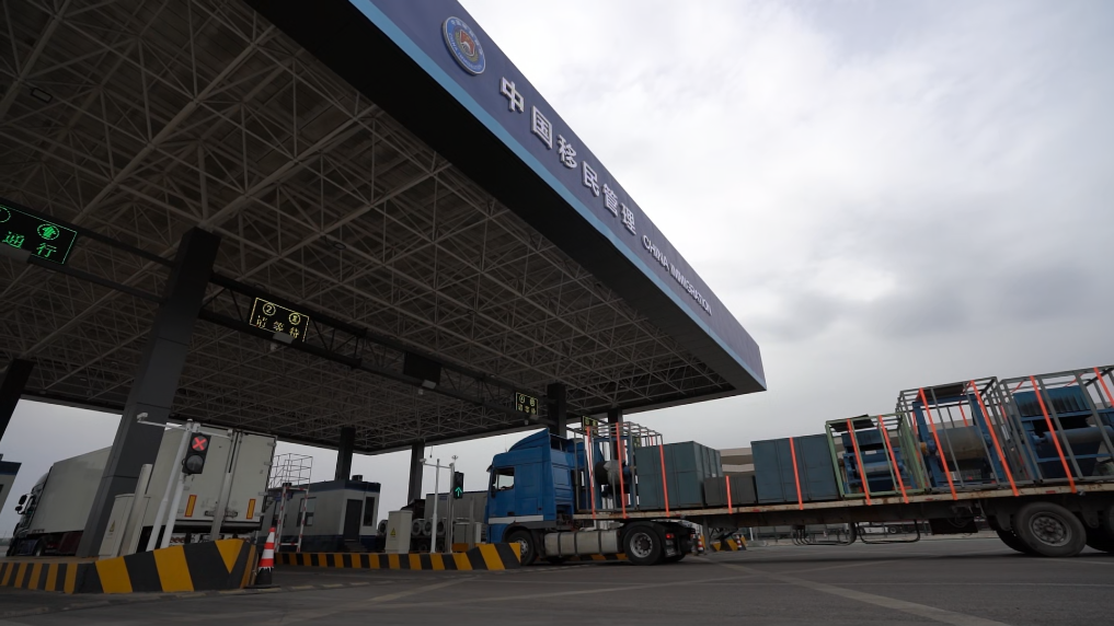 在霍爾果斯公路口岸,貨車、商品車、工程車等排成長龍,從中國駛向哈薩克斯坦。
